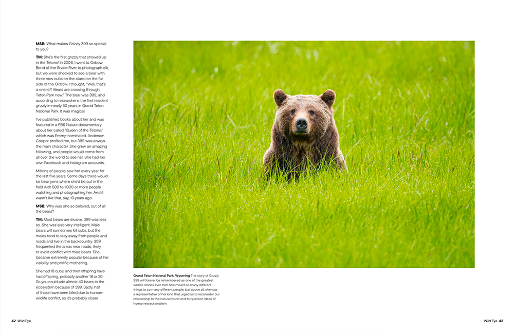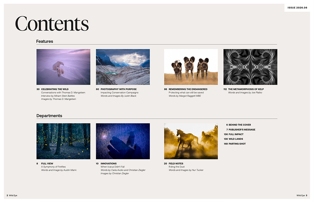 Wild Eye Issue 06 explores how photography can shape what comes next, honoring our responsibility to the natural world beyond the frame. Thomas D. Mangelsen reflects on Bear 399, Margot Raggett marks 10 years of the epic Remembering Wildlife book series and its conservation impact, and Justin Black shares practical ways photographers can support conservation. Together, these voices remind us that photography isn’t an endpoint, but an invitation to advocate and act.