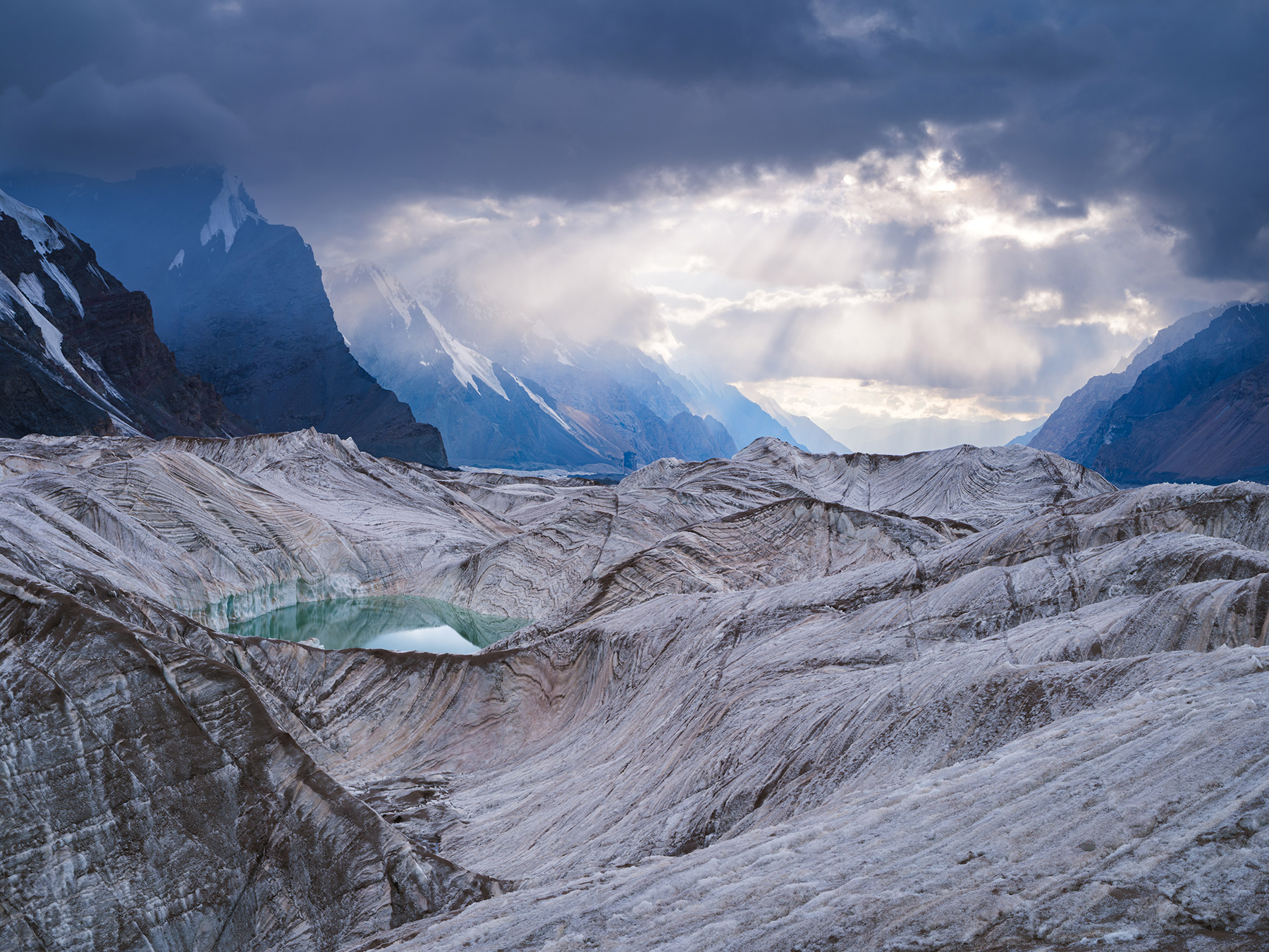 ↑ Tien Shan Mountains, Kyrgyzstan Evening on Zvezdochka Glacier. Shrinking glaciers appear dirtier because the melting process concentrates impurities that have accumulated over time and promotes the growth of dark- pigmented organisms, a phenomenon known as biological darkening. This darker surface then absorbs more solar energy, accelerating further melting. FUJIFILM GFX100S and GF FUJINON 45-100mmF4, 1/50 sec at F16, ISO 100