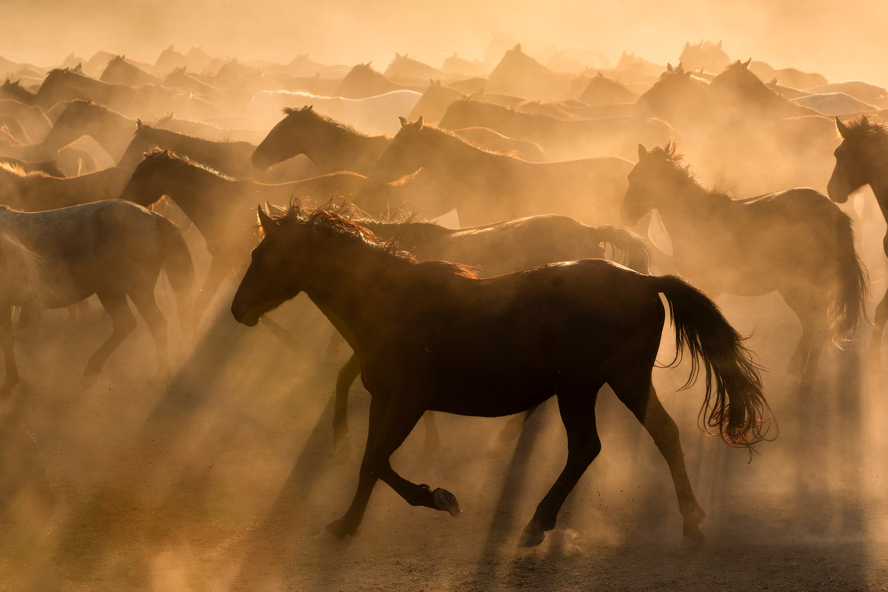 Hürmetçi Sazlığı Kayseri, Central Anatolia, Turkey Yılkı horses move through dust and golden light at sunset, their silhouettes revealing resilience, freedom, and ancient rhythms across Anatolia’s fragile steppe landscape.