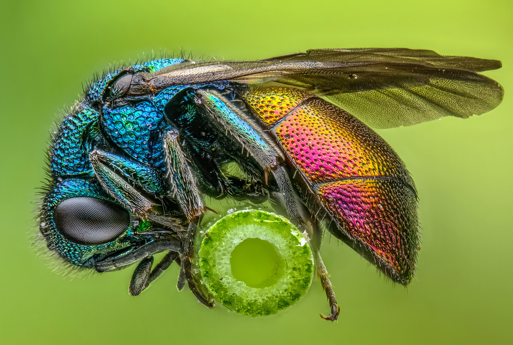 Masovian Landscape Park, Warsaw, Poland A cuckoo wasp rests balanced on a grass stem. These brilliantly colored parasitic wasps lay eggs in other insects’ nests, and the larva feed on the host species’ larva and stored pollen. 84-frame focus stack captured with a 5× microscope objective.