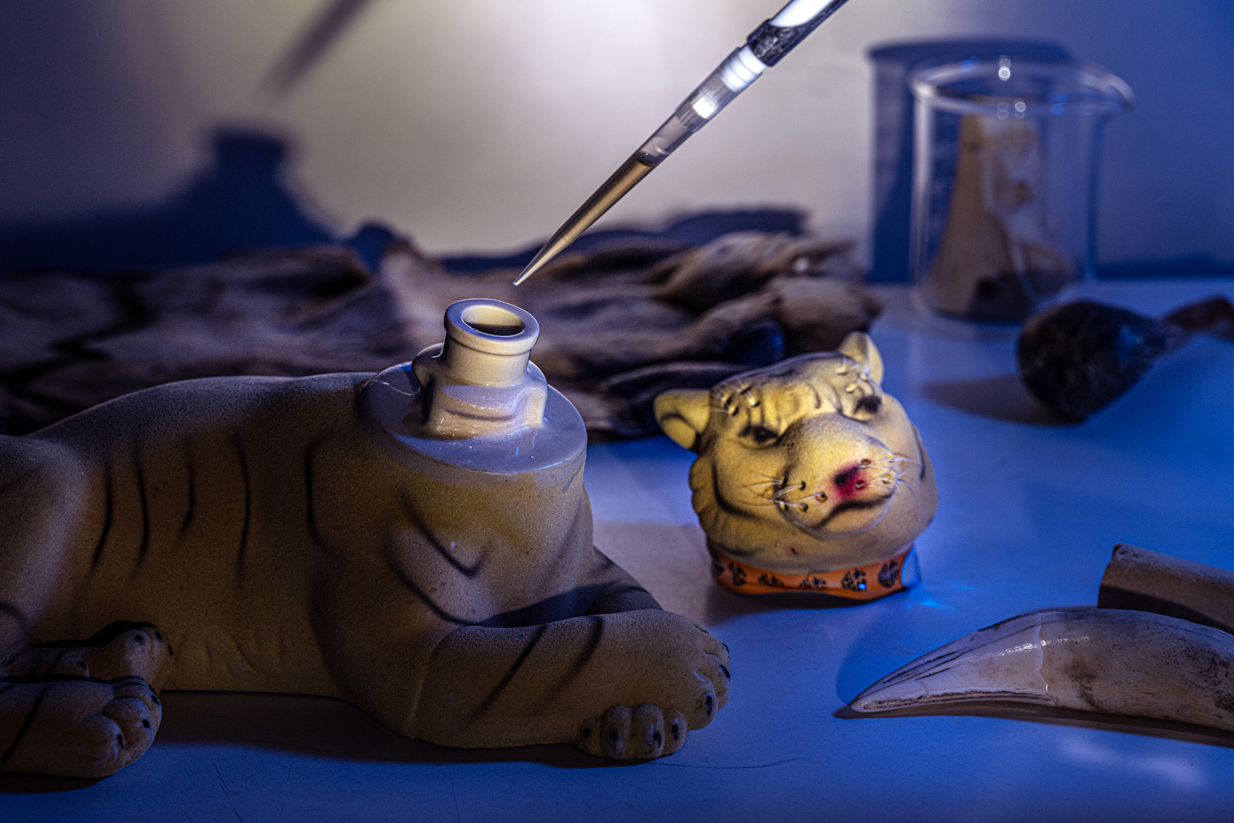 London, UK Researcher Louise Gibson, from the wildlife crime forensic lab at the Zoological Society of London, takes a sample from a tiger bottle full of “tiger bone wine.” A rapid qPCR test can detect tiger DNA in processed products, helping to identify big cat species illegally poached.